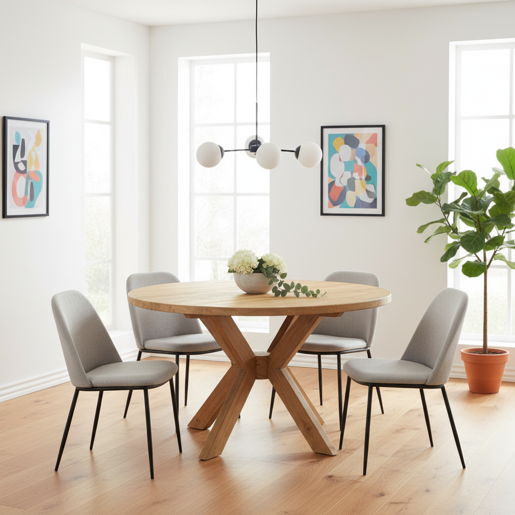 La forma rotonda favorisce la convivialità, eliminando le gerarchie dei posti a capotavola e permettendo a tutti di vedersi e conversare facilmente. La base a gambe incrociate garantisce stabilità senza ingombrare con gambe agli angoli, offrendo massima libertà di movimento.