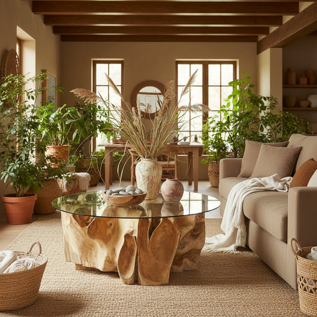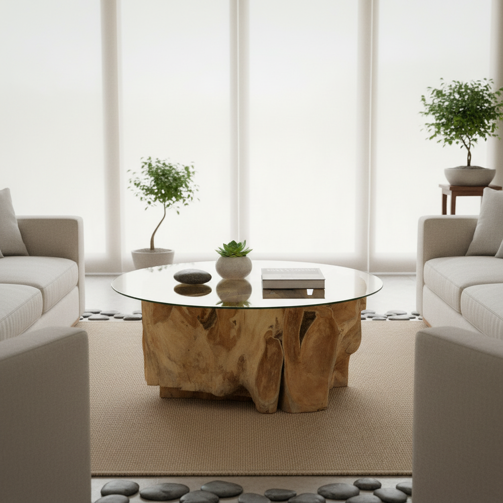 Tavolino da Caffè in Radice di Teak e Vetro – Opera d'Arte Naturale Unica